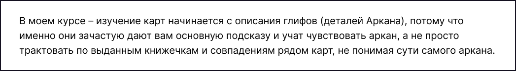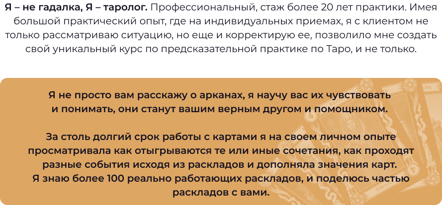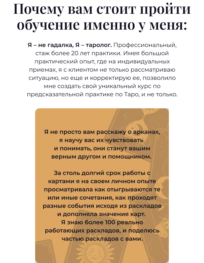 Перед началом обучения я обучаю вас входить в «рабочее состояние» и соединяться с хрониками Акаши, для прописи себя в эгрегоре гадателя. После многих курсов изучения Таро, в мою школу приходят ученики переучиваться, потому что просто не получают тех знаний, что им нужно.