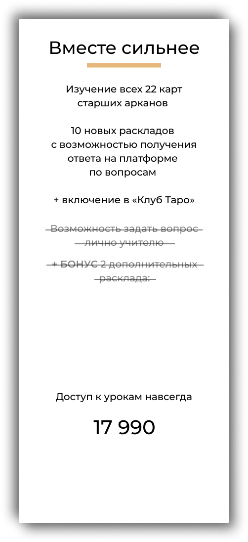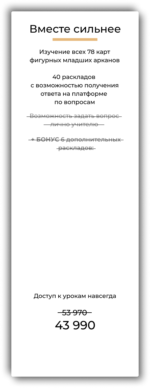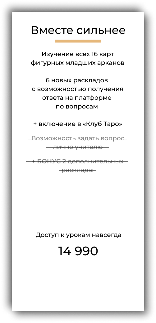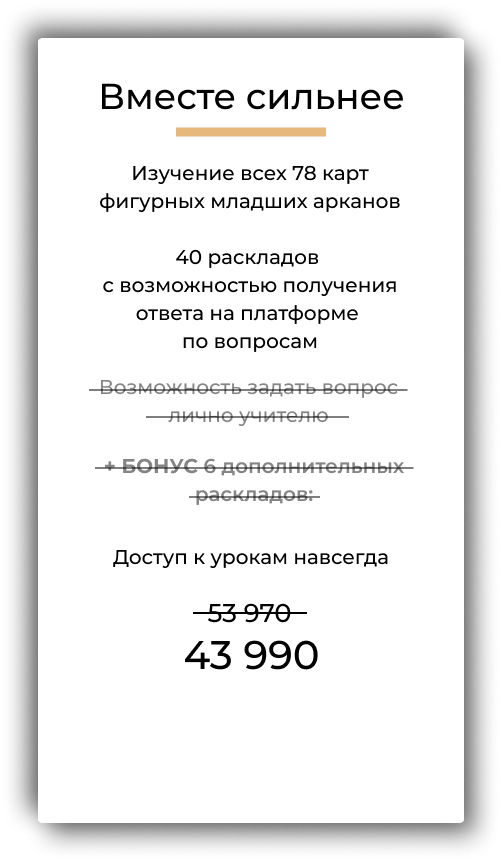 В каждом уроке мы изучаем по 3-4 карты, а так проходим сразу 2-3 новых расклада, где учимся от меньшего к большему смотреть сочетания карт и их трактовку, читать не каждую карту, а общую суть, которая заложена в раскладе.